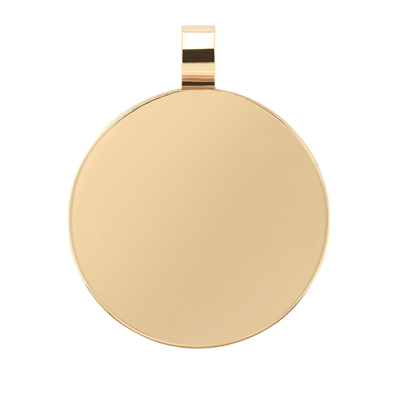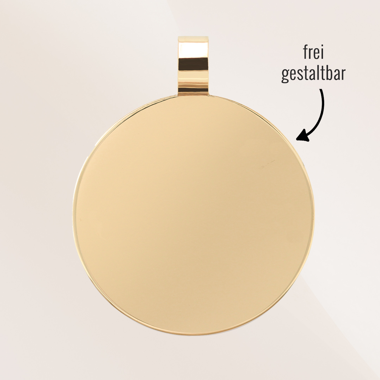 Der runde Anhänger ist in unterschiedlichen Größen und Farben sowie in verschiedenen Ausführungen der Ösen erhältlich, während wir jedes Schmuckstück in Echtgold personalisiert für Dich von Hand anfertigen.