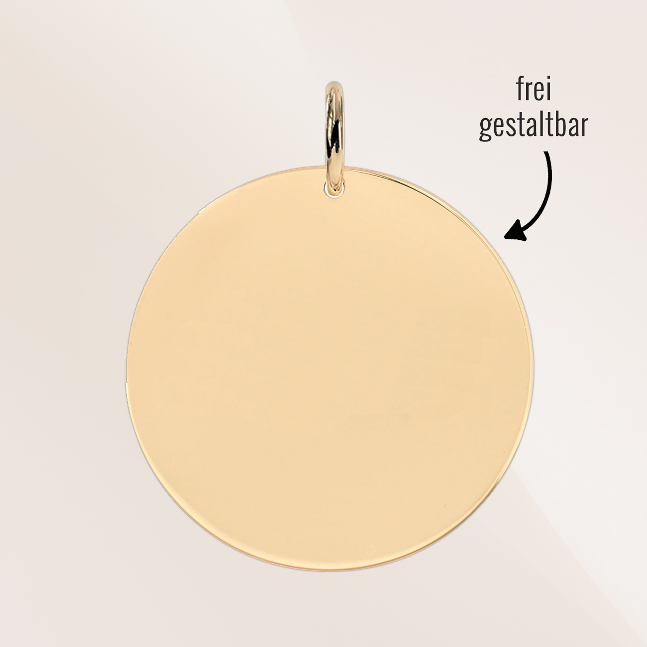 Der runde Anhänger ist in unterschiedlichen Größen und Farben sowie in verschiedenen Ausführungen der Ösen erhältlich, während wir jedes Schmuckstück in Echtgold personalisiert für Dich von Hand anfertigen.