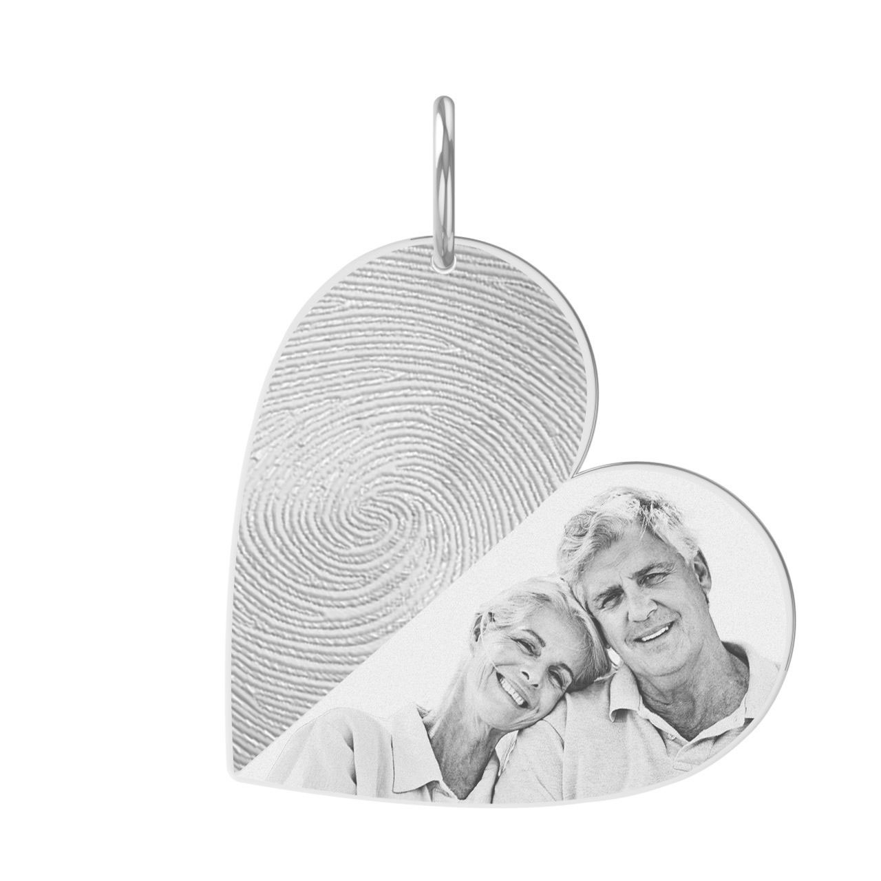 Auf der Vorderseite wird auf einer Hälfte des Herzens Ihr Fingerabdruck sowie auf der anderen Seite ein Foto Ihrer Wahl graviert. Das Foto wird per Lasertechnik graviert. Für den Fingerabdruck steht Ihnen die Diamantspitzgravur (in unserem Beispielbild abgebildet) oder die Lasergravur zur Auswahl. Bitte beachten Sie, dass die Diamantspitzgravur nur bei einer 0,5 mm Variante wählbar ist.