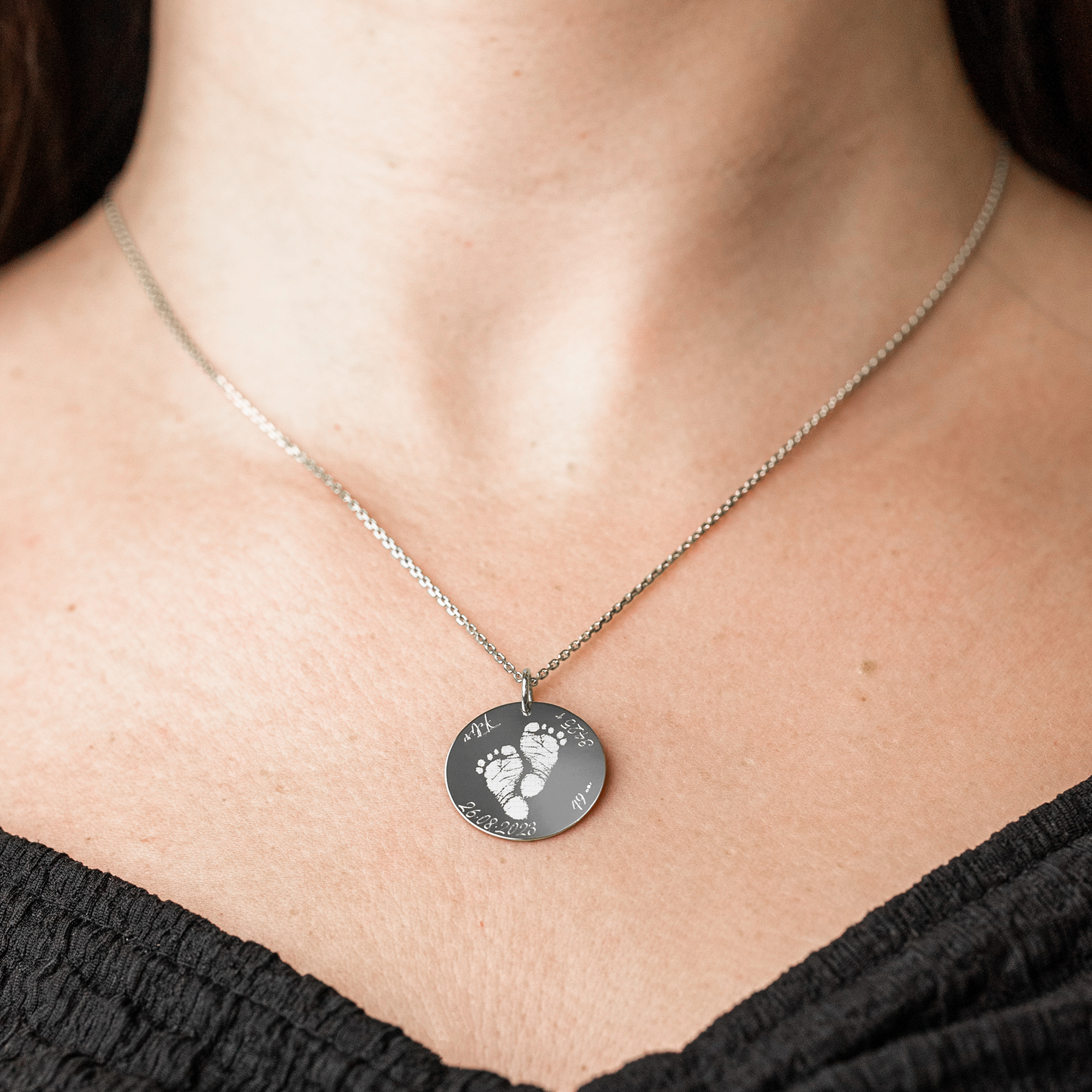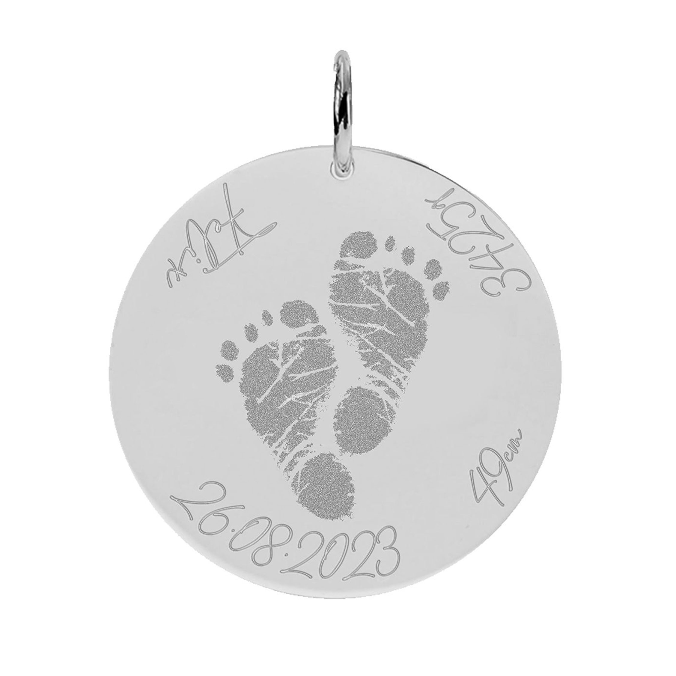 Produktinformationen "Fußabdruck Geburt Daten Gravuranhänger Rund aus echtem 585er Weißgold - AN407W"