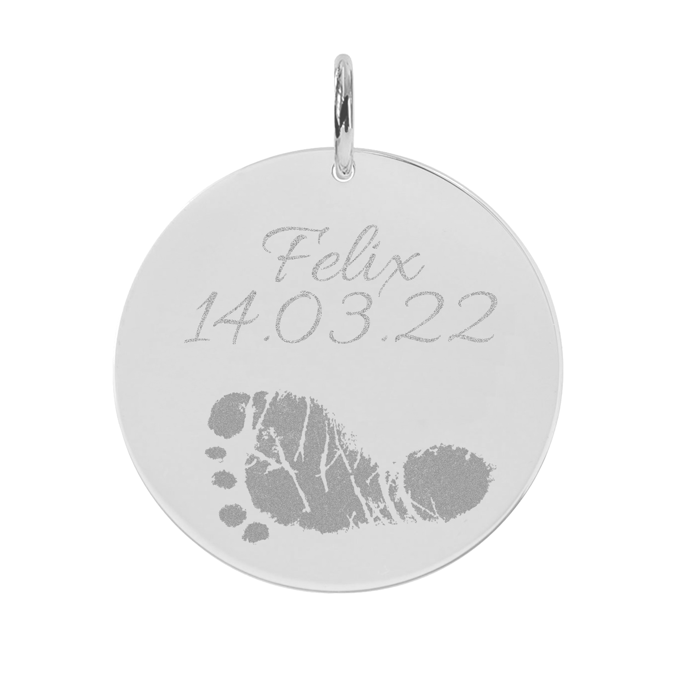 Fußabdruck Geburt Daten Gravuranhänger Rund aus echtem 585er Weißgold